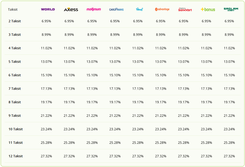 Vade farkları ve komisyon oranları, kredi kartı sağlayıcıları tarafından belirlenen standart ücretlerdir ve ürün veya hizmet fiyatlarımız üzerinde herhangi bir etkisi yoktur. Bizim sunduğumuz fiyatlar, yalnızca ürünün veya hizmetin gerçek maliyetini yansıtır ve vade farkları, kredi kartı şirketleri tarafından uygulanan ek maliyetlerdir. Bu nedenle, vade farklarını ve komisyon oranlarını incelemek, alışverişinizin toplam maliyetini doğru bir şekilde hesaplamanıza yardımcı olacaktır.